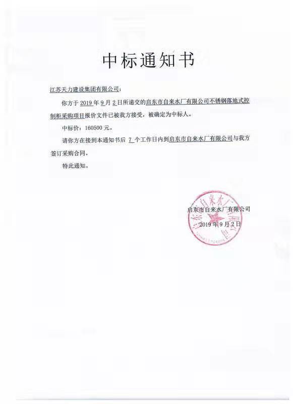 启东市自来水厂有限公司不锈钢落地式控制柜采购项目中标通知
