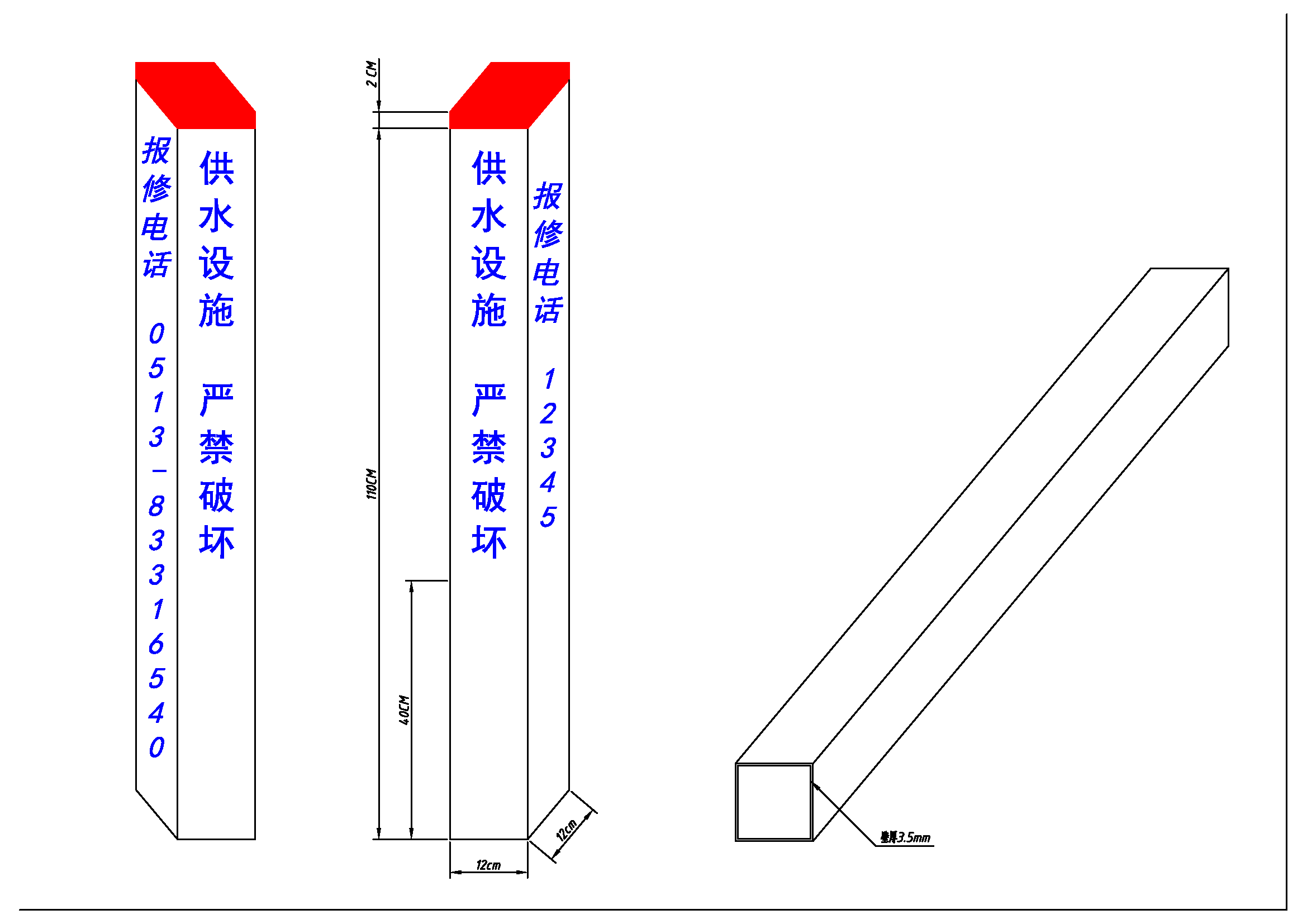 2、警示桩正面和背面印刷: 供水设施 严禁破坏,字体黑体,颜色红色。